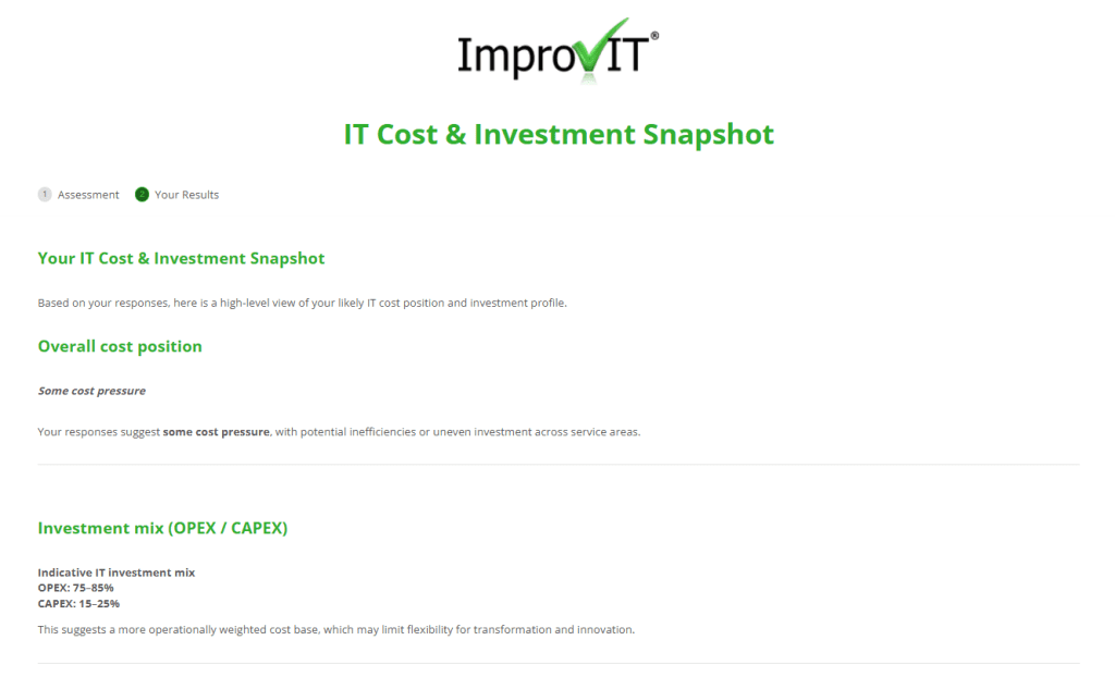 Answer 7 short questions to receive a quick, independent view of your likely IT cost position and investment mix, including indicative OPEX/CAPEX balance.